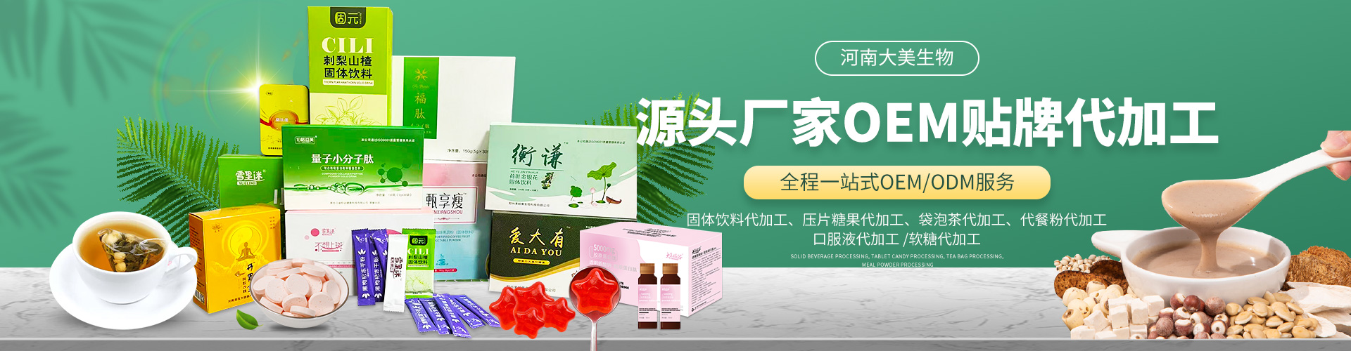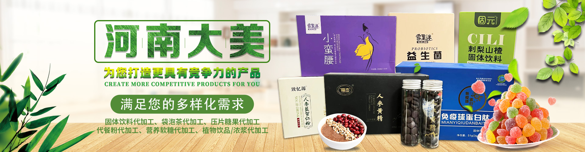 河南大美生物科技股份有限公司是從事顆粒劑、(固體飲料類),壓片糖果代加工等研發(fā)和銷售為一體的生產(chǎn)企業(yè)。公司依托自身的高科技研發(fā)隊(duì)伍和營銷團(tuán)隊(duì),為國內(nèi)外客戶提供營養(yǎng)食品各劑型和規(guī)格的研制、生產(chǎn)、配方設(shè)計(jì)、批文申報(bào)等服務(wù),并為客戶提供多種形式的流通渠道及產(chǎn)品銷售服務(wù)工作。 您的要求就是我們的使命!我們的宗旨是與客戶“合作共贏,攜手向前”,共同創(chuàng)造事業(yè)新的輝煌!